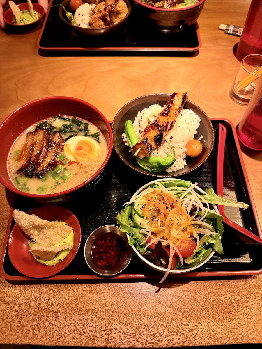 Lunch special (called “express lunch”) is on point, at time I visited it was $17.95. You get a half portion ramen of choice, half portion rice plate, miso salad, and small (2-3 bites) of the edamame hummus with rice crisps. Lots of umami and the salad was refreshing. Place has thoughtful lighting, with lights directed specifically at tables as not to overwhelm the whole interior.